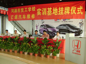 10月26日上午,河源市技工學(xué)校匯源汽車銷售公司實(shí)訓(xùn)基地掛牌儀式在匯源汽車銷售公司舉行。河源市技工學(xué)校100多名師生、匯源汽車銷售公司部分員工參加了掛牌儀式。市委常委、市政府副市長(zhǎng)楊耀初同志,市政府邱榮輝副秘書長(zhǎng),及市勞動(dòng)保障局等部門領(lǐng)導(dǎo)出席了掛牌儀式。掛牌儀式由市勞動(dòng)保障局歐繼勝副局長(zhǎng)主持,匯源集團(tuán)賴運(yùn)宏董事長(zhǎng)在掛牌儀式上致詞,市技工學(xué)校歐陽仕文校長(zhǎng)發(fā)表講話。最后,楊耀初副市長(zhǎng)作了重要講話。楊副市長(zhǎng)充分肯定了匯源汽車銷售公司與市技工學(xué)校的合作,高度贊揚(yáng)了匯源汽車銷售公司勇?lián)鐣?huì)責(zé)任、充滿愛心的企業(yè)精神;希望校企繼續(xù)努力,更快、更好地為社會(huì)培養(yǎng)更多、更優(yōu)的有用人才!